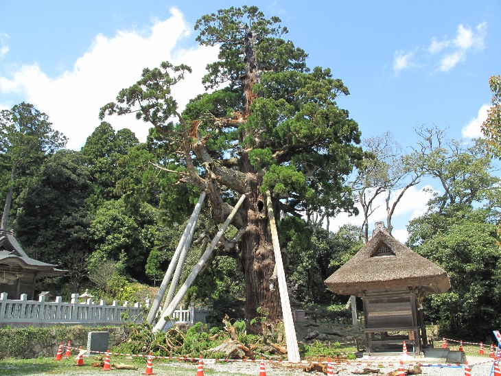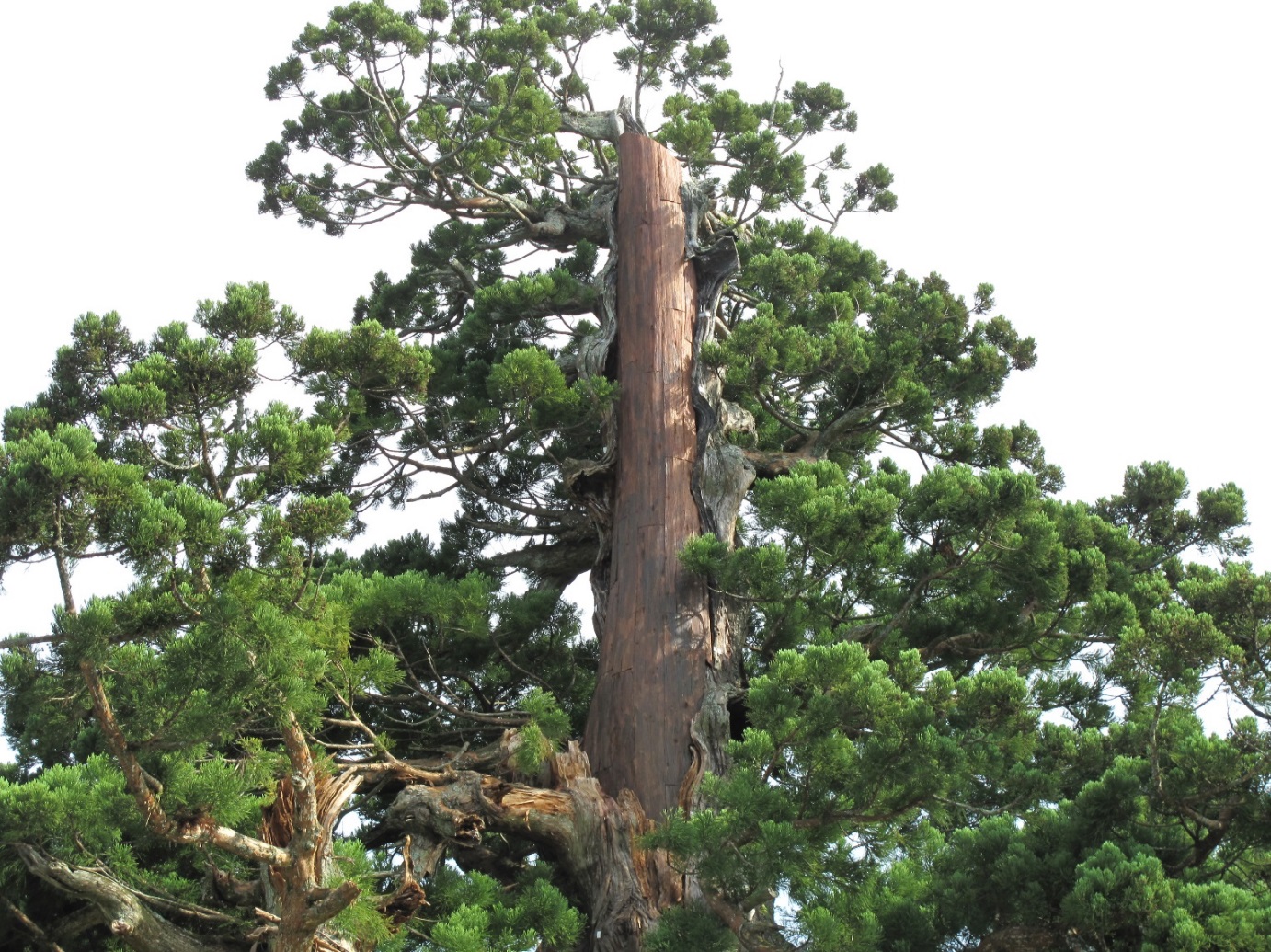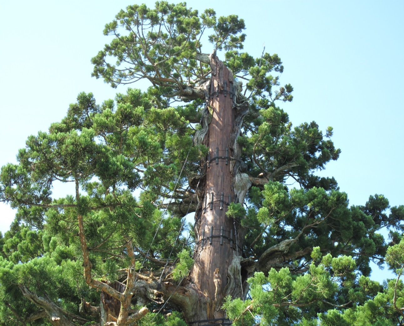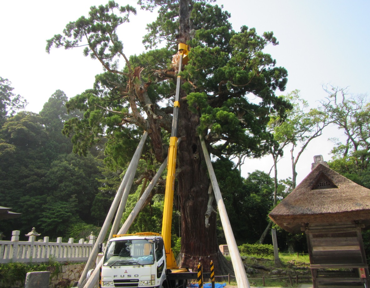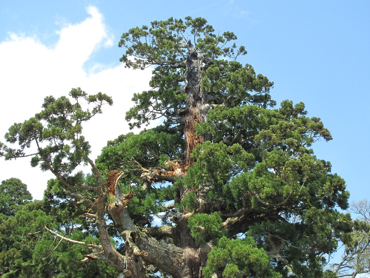平成28年4月9日(土)午後2時半頃、突然国指定天然記念物八百杉の上部の太枝が崩落し幹や枝が大きく損傷した。隠岐の島町教育委員会より、八百杉の樹勢回復事業に関わってきた樹木医に、診断と今後の対策等について指導依頼があり、現地調査を、その対策と治療に当った。